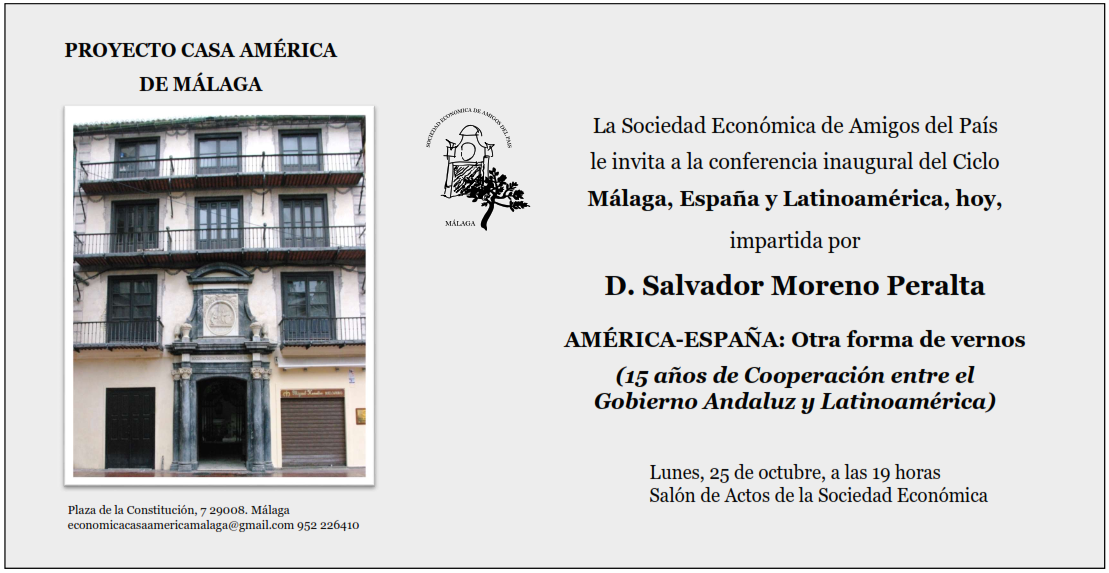 El ciclo 'Málaga, España y Latinoamérica, hoy' arranca el próximo lunes, 25 de octubre con la Conferencia Inaugural 'América-España: Otra forma de vernos (15 años de Cooperación entre el Gobierno Andaluz y Latinoamérica)' a cargo de D. Salvador Moreno Peralta, arquitecto y urbanista.