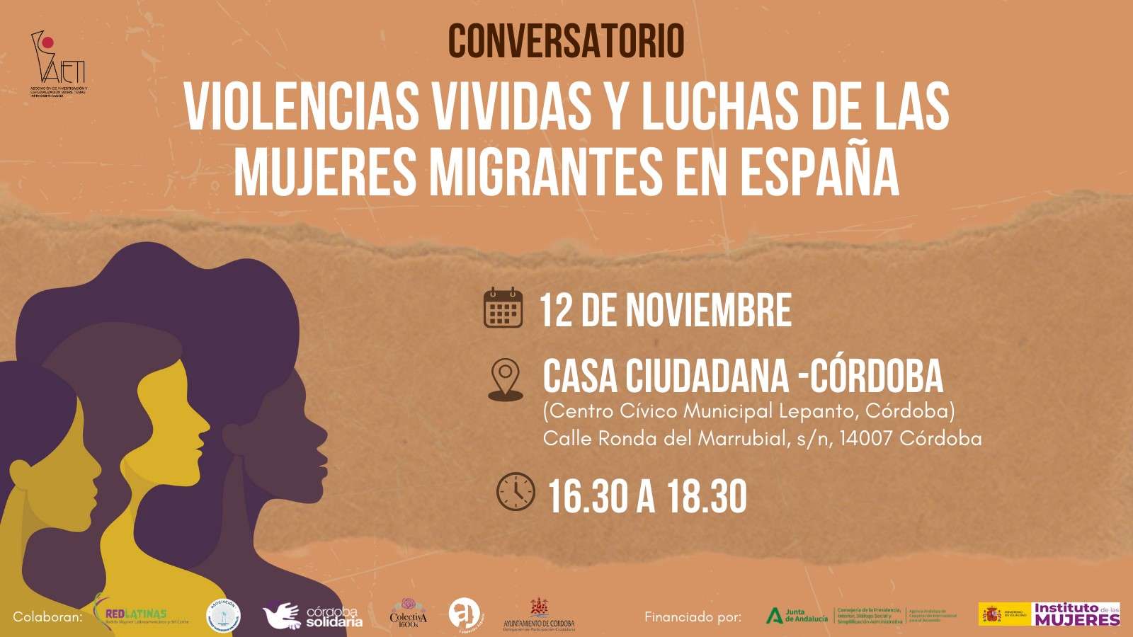 En el marco del 25 de noviembre, Día Internacional de la Eliminación de la Violencia contra las Mujeres, AIETI realiza un conversatorio en Córdoba para visibilizar las múltiples violencias que viven las mujeres migrantes, así como la lucha constante por sus derechos. Esta actividad es organizada por AIETI con la colaboración de Red Latinas, Cuidadoras Sin Papeles de Málaga, Colectiva 1600s, Córdoba Solidaria, Ayuntamiento de Córdoba y la financiación de la Agencia Andaluza de Cooperación al Desarrollo y el Instituto de las Mujeres.