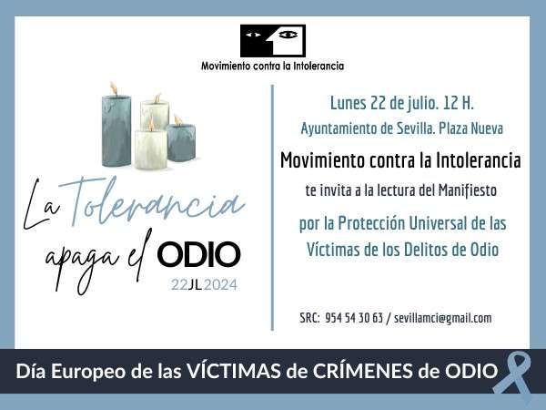 Movimiento contra la Intolerancia organiza un acto con motivo del Día europeo en memoria de las víctimas de los crímenes de odio el próximo lunes 22 de julio a las 12 horas en la puerta del Ayuntamiento de Sevilla, donde se hará lectura del manifiesto que año tras año cuenta con la adhesión de centenares de entidades.
