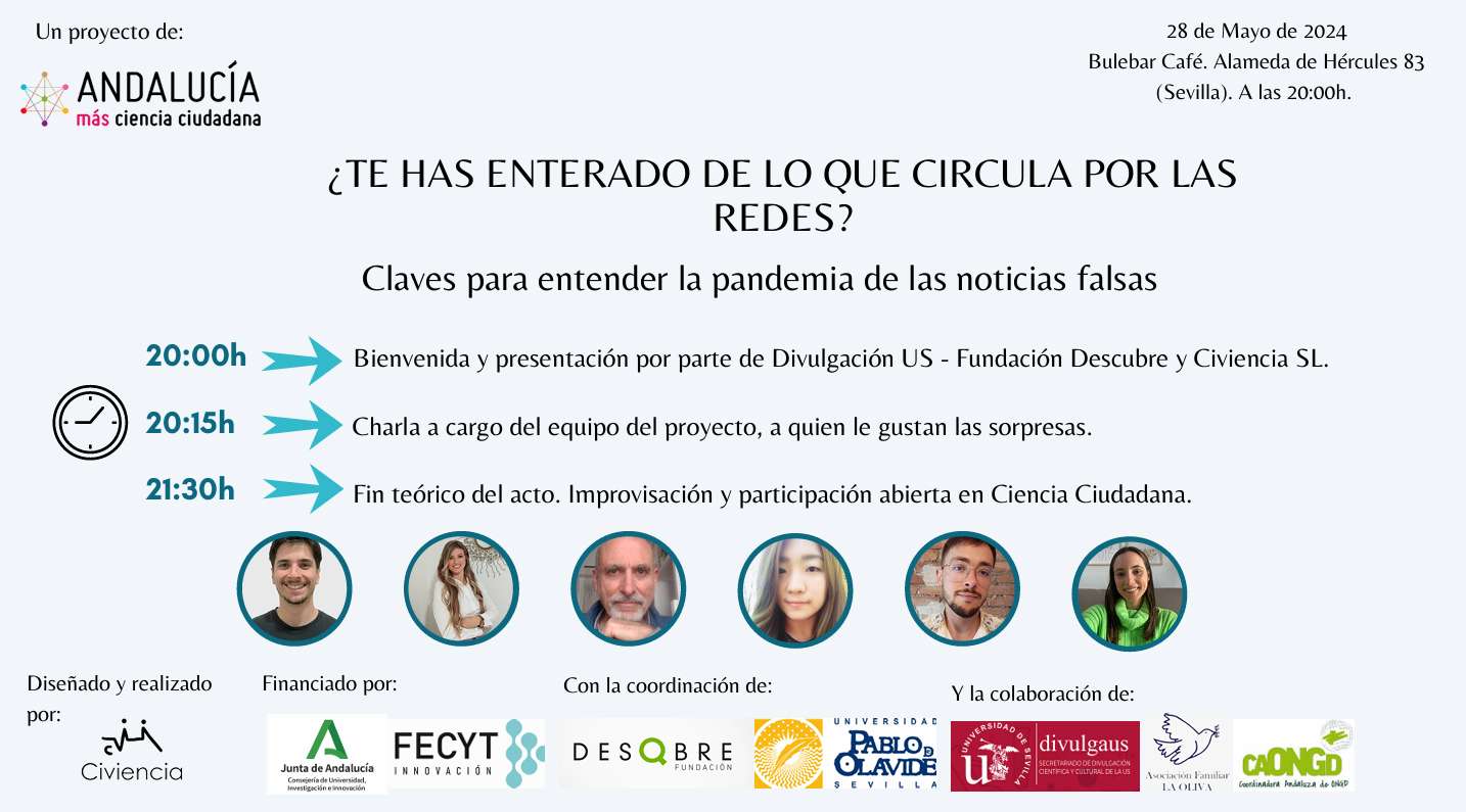 El 28 de mayo de 2024 a las 20 horas celebran un encuentro en el Bulebar Café de Sevilla (Alameda de Hércules 83) titulado Claves para entender la pandemia de las noticias falsas, con el siguiente programa: