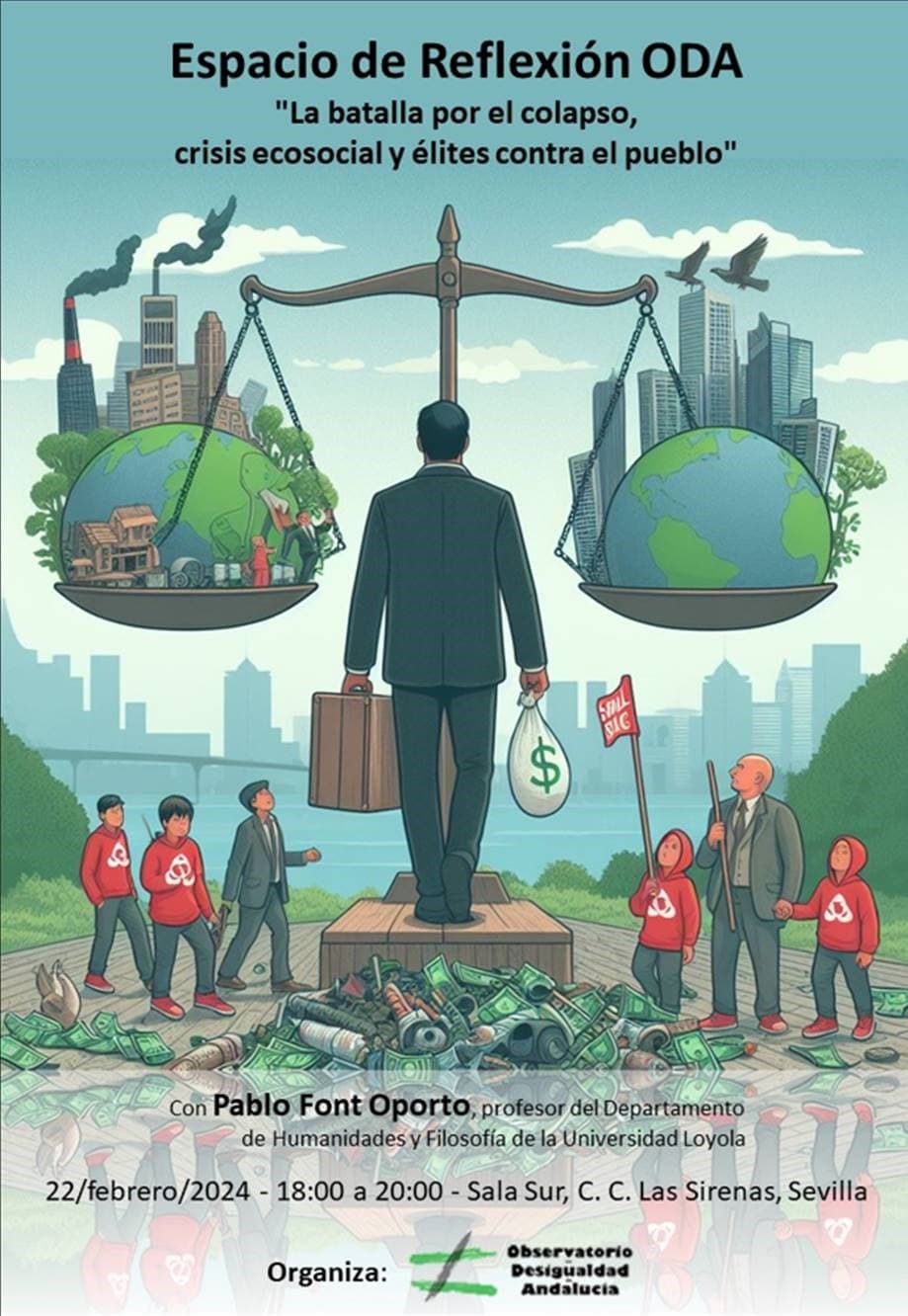 El próximo 22 de febrero, el Observatorio de Desigualdad de Andalucía (ODA) organiza el espacio de reflexión La batalla por el colapso, crisis ecosocial y élites contra el pueblo.