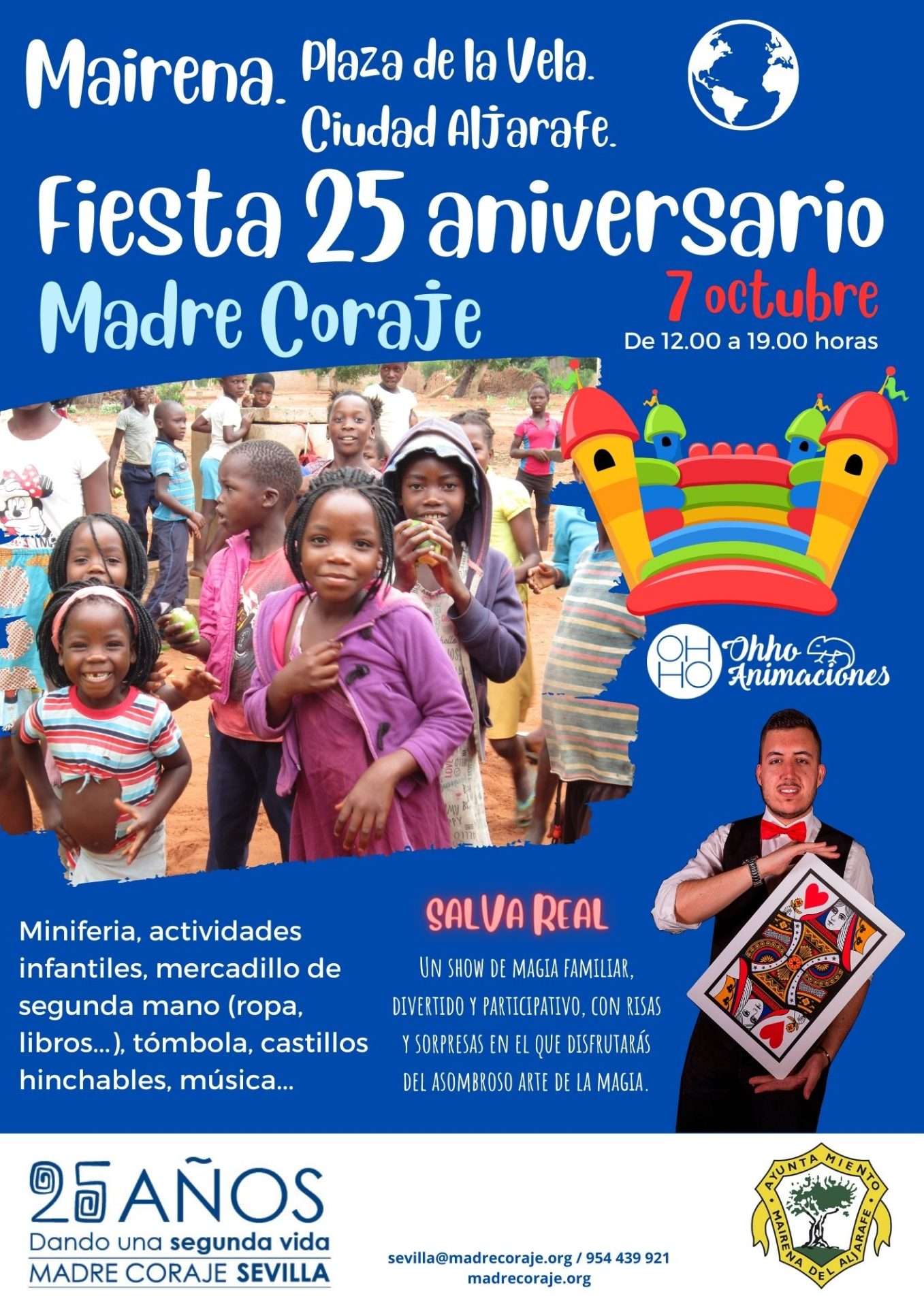 Madre Coraje celebra el próximo 7 de octubre, de 12.00 a 19.00 horas, en la Plaza de la Vela de Mairena del Aljarafe, en Ciudad Aljarafe, su fiesta 25 aniversario que contará con actividades infantiles, una miniferia, mercadillo de segunda mano de ropa y libros, tómbolas, castillo hinchable, música... Además, la cita albergará un show de magia familiar de la mano de Salva Real.