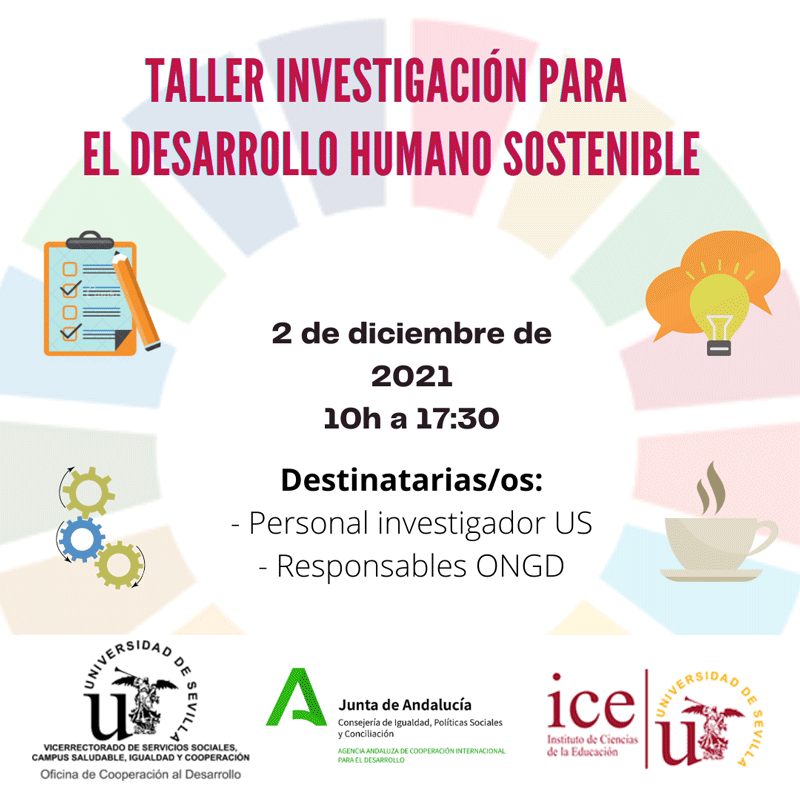 IMPORTANTE: Este Taller se ha organizado en el marco del proyecto Formación en Investigación para el Desarrollo con agentes de la Cooperación andaluza, que está siendo ejecutado por la Oficina de Cooperación al Desarrollo de la US con financiación de la AACID. El Taller se ha organizado como evento final del Curso “Investigación para el Desarrollo Humano Sostenible”, que constituye la Fase 1 de un proceso cuya Fase 2 será la puesta en marcha de un Programa de 10 Becas para que personal investigador de la US realice durante 2022 procesos de Investigación orientada al Desarrollo Humano Sostenible que den respuesta a necesidades identificadas por ONGD andaluzas.