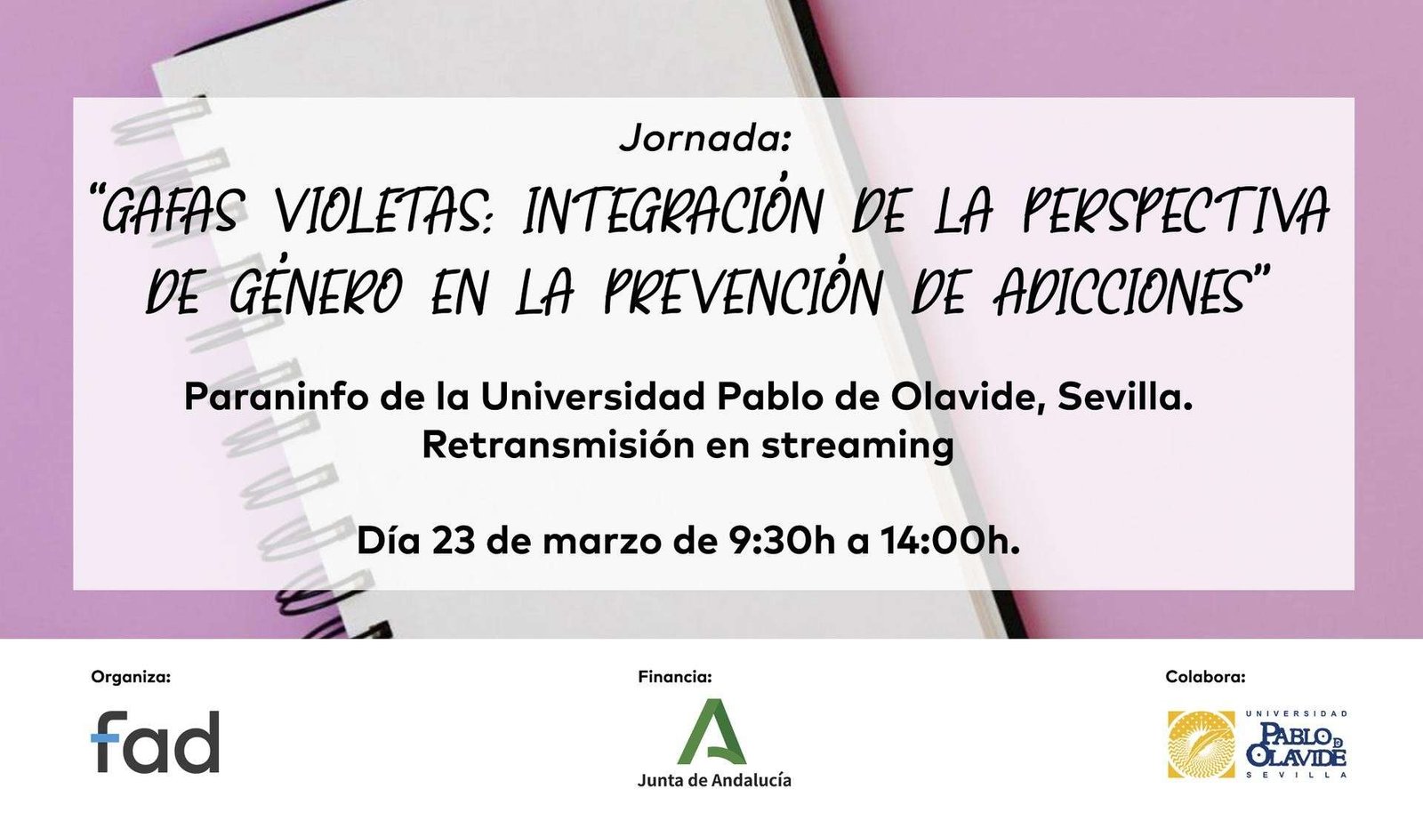 El próximo 23 de marzo se celebran las jornadas "Gafas violetas: integración de la Perspectiva de Género en la prevención de Adicciones", que se celebrará en el Paraninfo de la Universidad Pablo de Olavide (UPO) de Sevilla y se retransmitirá en directo en streaming.