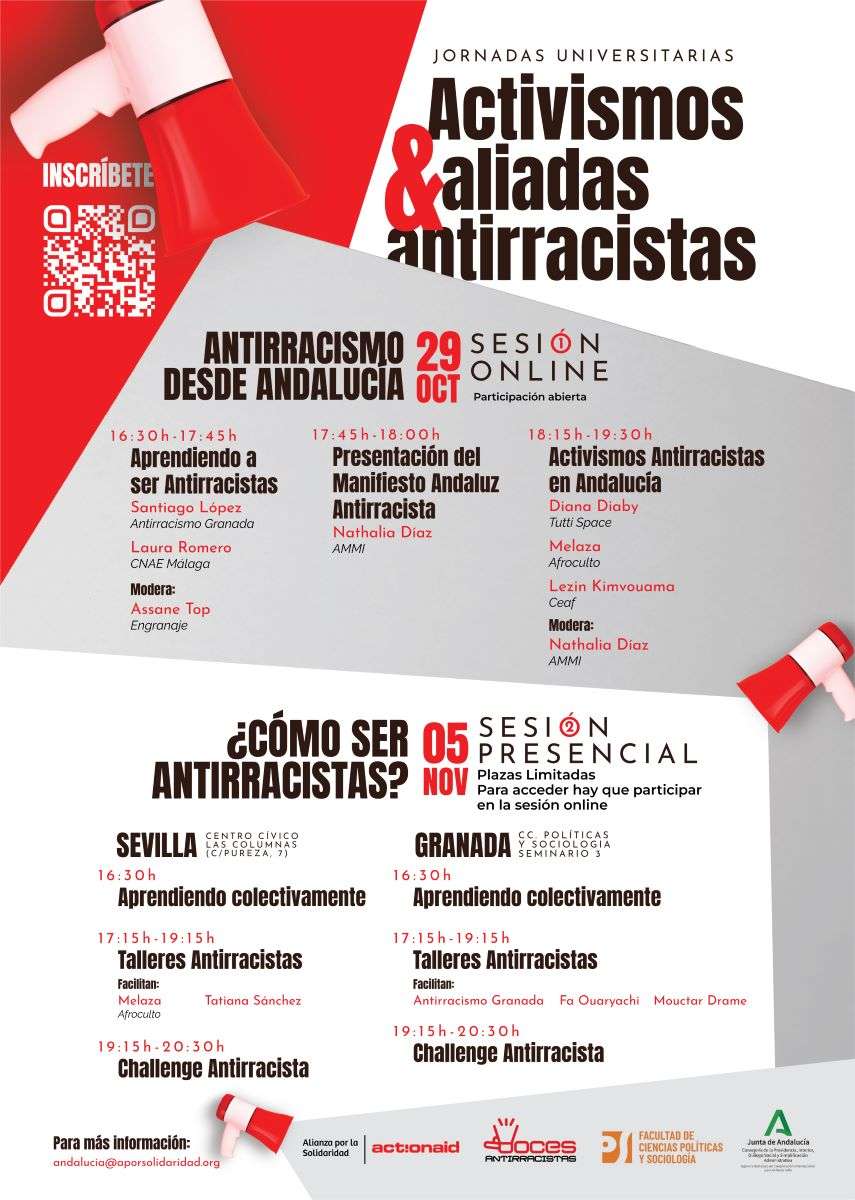Alianza por la Solidaridad organiza las Jornadas Universitarias “Activismos y Aliadas Antirracistas” que se divide en dos sesiones. La sesión 1 será online y la sesión 2 será presencial en Granada y Sevilla.