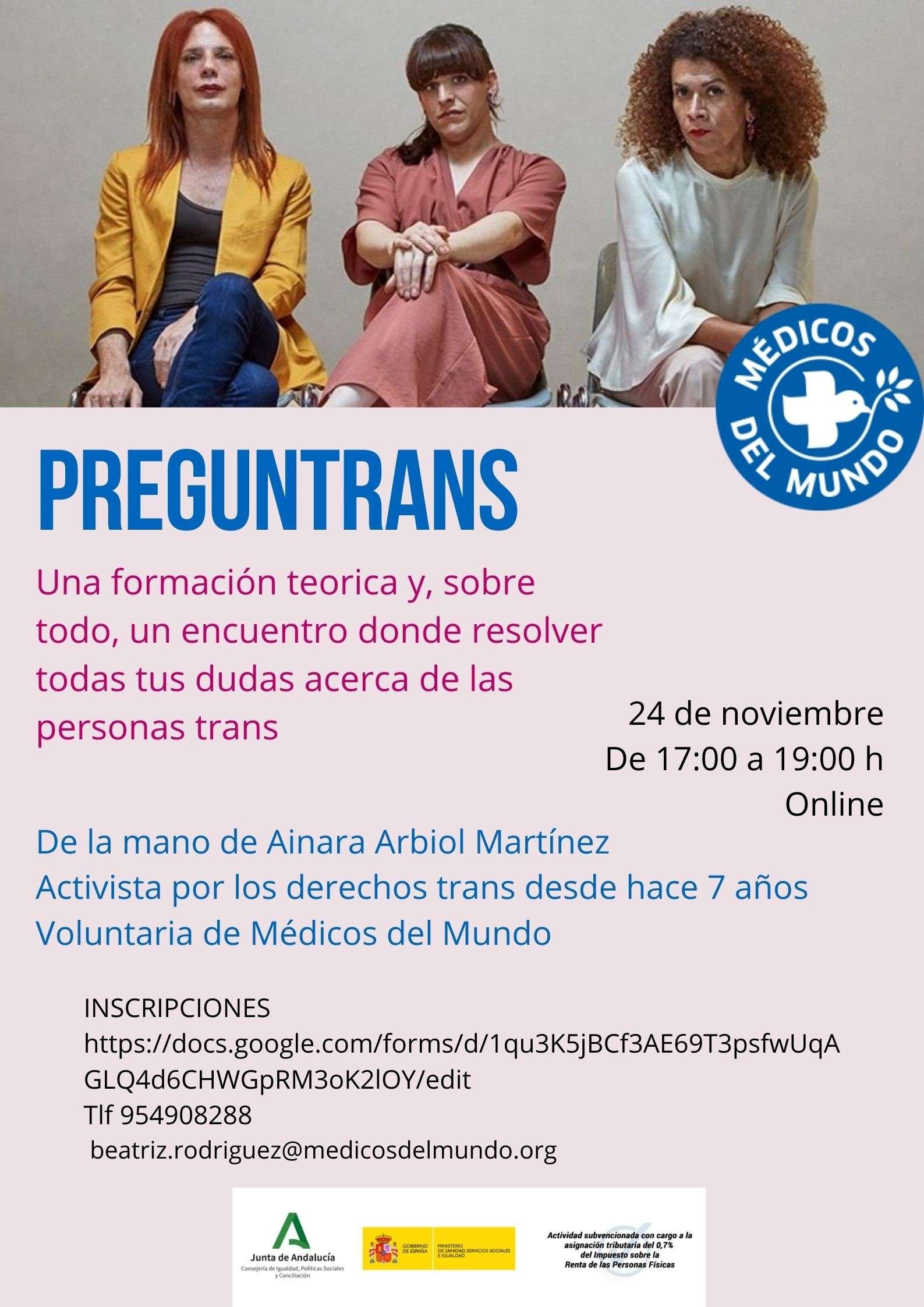 Preguntrans es una actividad pensada para las personas voluntarias de entidades sociales andaluzas, que se enmarca dentro de nuestro proyecto Gestión, acompañamiento, formación y cohesión del voluntariado en Médicos del Mundo Andalucía, financiado por la Consejería de Igualdad, Políticas Sociales y Conciliación con cargo a la asignación tributaria del 0,7% del IRPF.