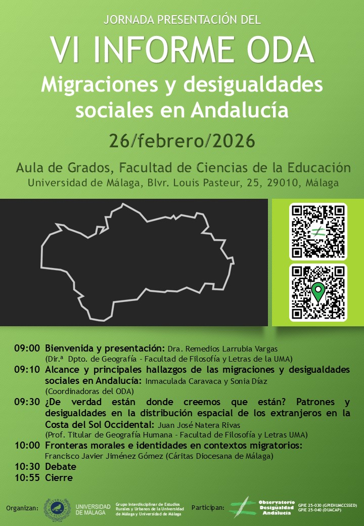 El evento contará con la participación de expertas del Observatorio de Desigualdad de Andalucía, personal docente de la UMA y representantes de entidades sociales, ofreciendo una visión integral que combina el análisis de datos, la distribución espacial en zonas clave como la Costa del Sol y la dimensión ética en los contextos migratorios.