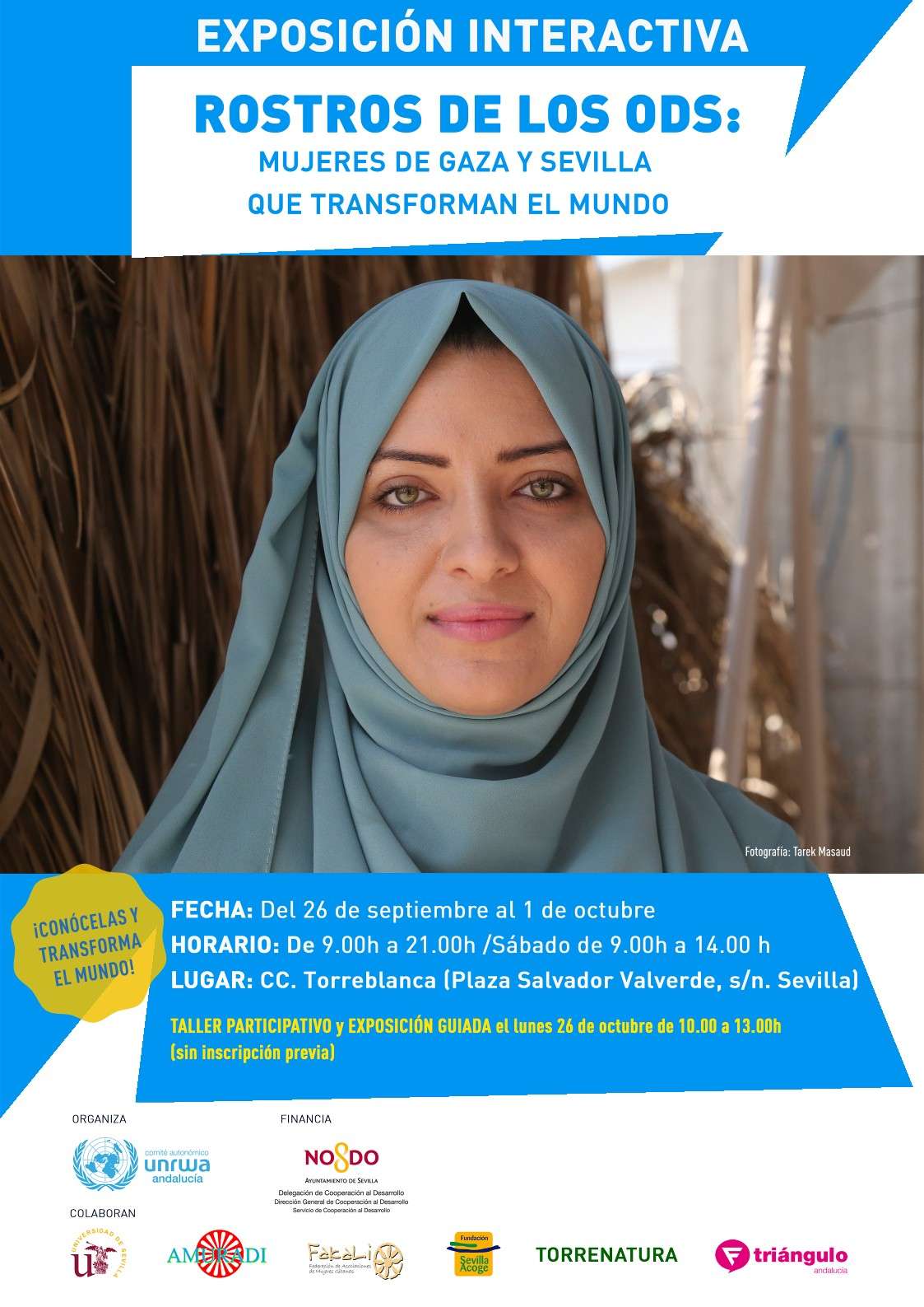 La exposición forma parte del proyecto que desarrolla UNRWA Andalucía Rostros de los ODS, financiado por la Dirección General de Cooperación al Desarrollo del Ayuntamiento de Sevilla. con la colaboración, entre otras, de Sevilla Acoge y Fundación Triángulo.