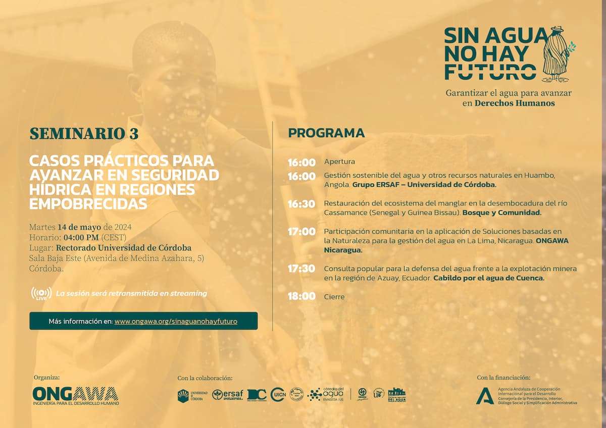 El próximo martes 14 de mayo , de 16 a 18 horas (CEST) ONGAWA expone en un seminario en Córdoba una selección de casos prácticos de referencia para abordar la problemática hídrica en África y América Latina y que han sido impulsadas por organizaciones sociales de base y apoyadas por agentes de la cooperación al desarrollo.