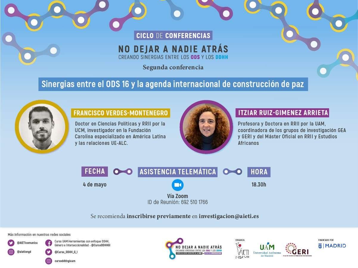 Es la segunda del ciclo de conferencias temáticas No dejar a nadie atrás. Creando sinergias entre los ODS y los DDHH en las que abordaremos los desafíos para la consecución de los ODS referentes a la igualdad de género, la construcción de paz, la defensa de los ecosistemas y el derecho al medio ambiente, o la salud, entre otros.
