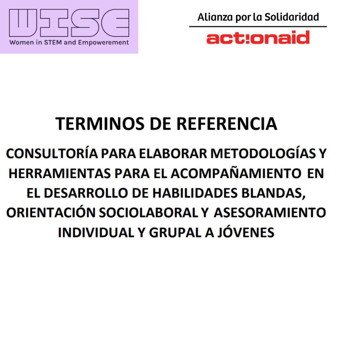 Alianza por la Solidaridad oferta una consultoría para elaborar metodologías y herramientas para el acompañamiento de jóvenes en el desarrollo de habilidades blandas y búsqueda de empleo y asesoramiento individual y grupal a jóvenes en el marco del proyecto financiado por la UE, “WISE: Women in STEM and digital Empowerment”.