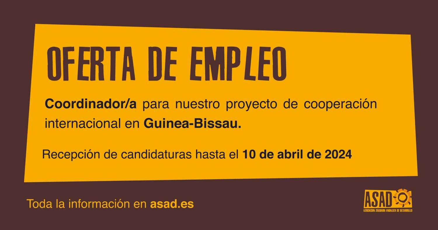ASAD oferta un puesto de coordinador/a para uno de sus proyectos en Guinea Bissau. La ONGD cuenta con su sede principal en la ciudad de Granada, España, desde donde coordina la ejecución de proyectos de cooperación en Guatemala, Colombia, República Dominicana y Guinea-Bisáu, a la vez que acompaña la ejecución de los proyectos de Educación y Acción Social que se desarrollan en Andalucía.