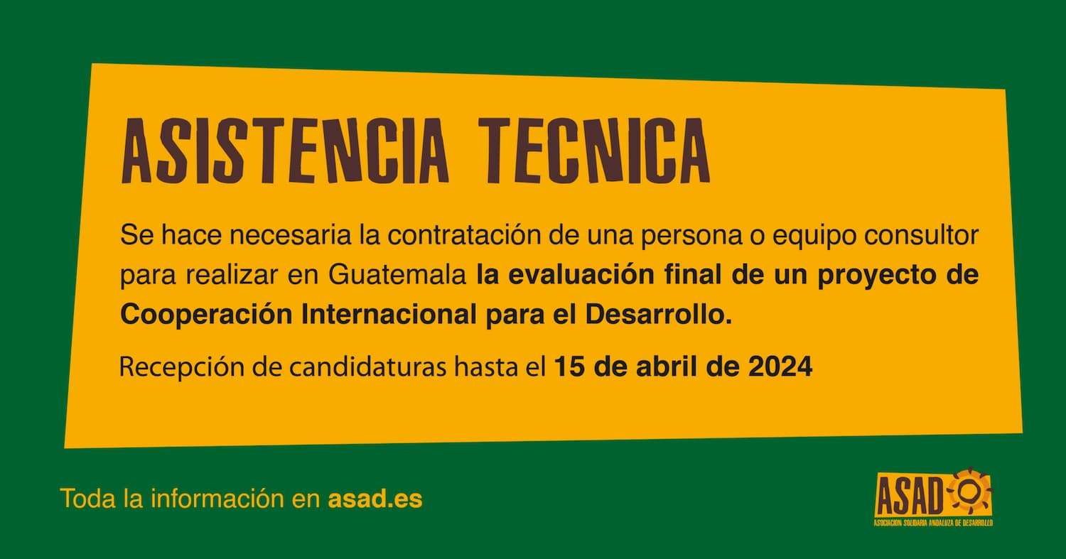 ASAD precisa contratar una persona o un equipo para realizar, en Guatemala, la evaluación externa del proyecto de cooperación internacional “Mejorar la prevención y atención de la violencia contra mujeres, adolescentes y niñas, agudizada por el COVID-19, en el departamento de Chimaltenango mediante el refuerzo del CAIMUS y las capacidades comunitarias e institucionales” (0C034/2021) financiada por la Agencia Andaluza de Cooperación para el Desarrollo.