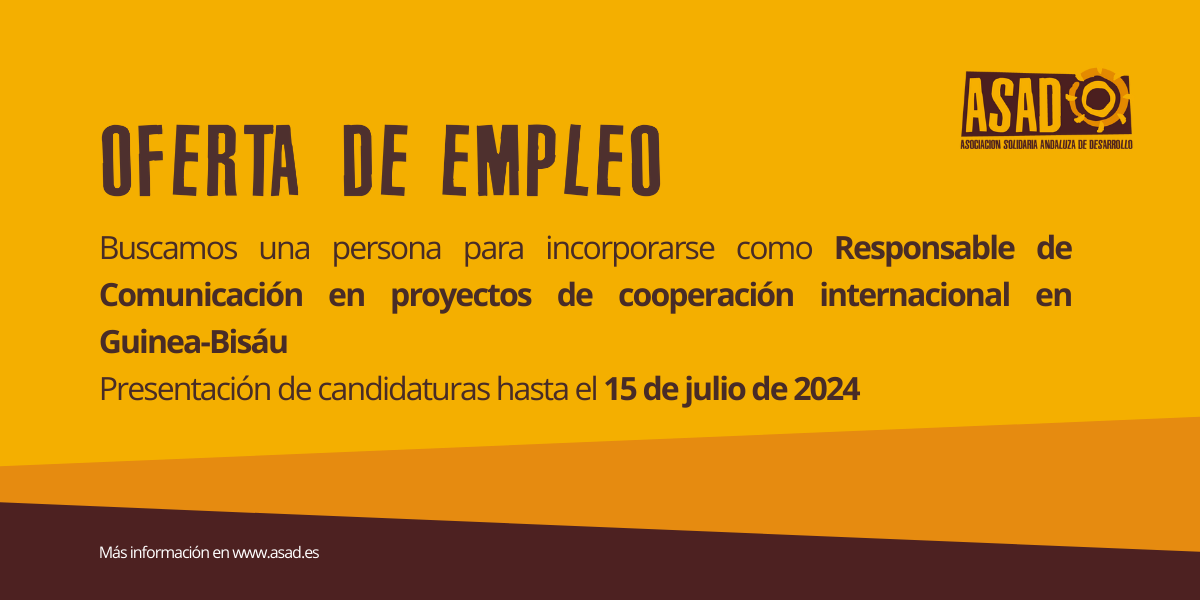 La Asociación Solidaria Andaluza de Desarrollo (ASAD) necesita los servicios de un/a Responsable de Comunicación. Esta asociación cuenta con su sede principal en la ciudad de Granada, España, desde donde coordina la ejecución de proyectos de cooperación en Guatemala, Colombia, República Dominicana y Guinea-Bissau, a la vez que acompaña la ejecución de los proyectos de Educación y Acción Social que se desarrollan en Andalucía.