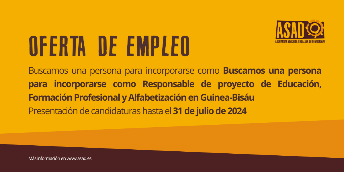 La Asociación Solidaria Andaluza de Desarrollo (ASAD) necesita los servicios de un/a responsable de proyecto de Educación, Formación Profesional y Alfabetización en Guinea-Bisáu. ASAD cuenta con su sede principal en la ciudad de Granada, España, desde donde coordina la ejecución de proyectos de cooperación en Guatemala, Colombia, República Dominicana y Guinea-Bissau, a la vez que acompaña la ejecución de los proyectos de Educación y Acción Social que se desarrollan en Andalucía.