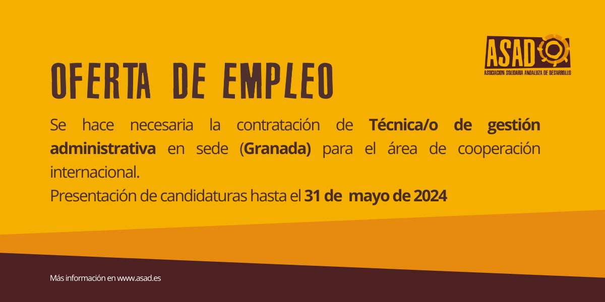 La Asociación Solidaria Andaluza de Desarrollo (ASAD) precisa contratar una persona como técnica de gestión administrativa en sede para el área de cooperación internacional. Nace en Granada en 2005 como ONGD sin ánimo de lucro con el objetivo de contribuir a la justicia social a través de la promoción de los Derechos Humanos, su respeto y defensa y la lucha contra las causas de la desigualdad.