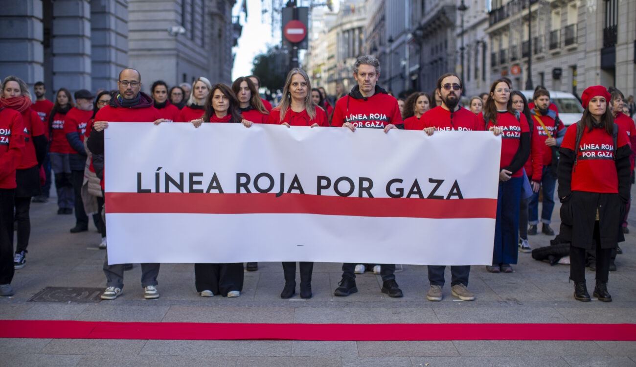 Representantes y activistas de 15 organizaciones han marcado este jueves una línea roja por Gaza en el centro de Madrid para recordar que, a pesar del alto el fuego, la catástrofe humanitaria continúa y la población palestina en Gaza sigue sumida en una realidad insoportable que pone en peligro sus vidas.