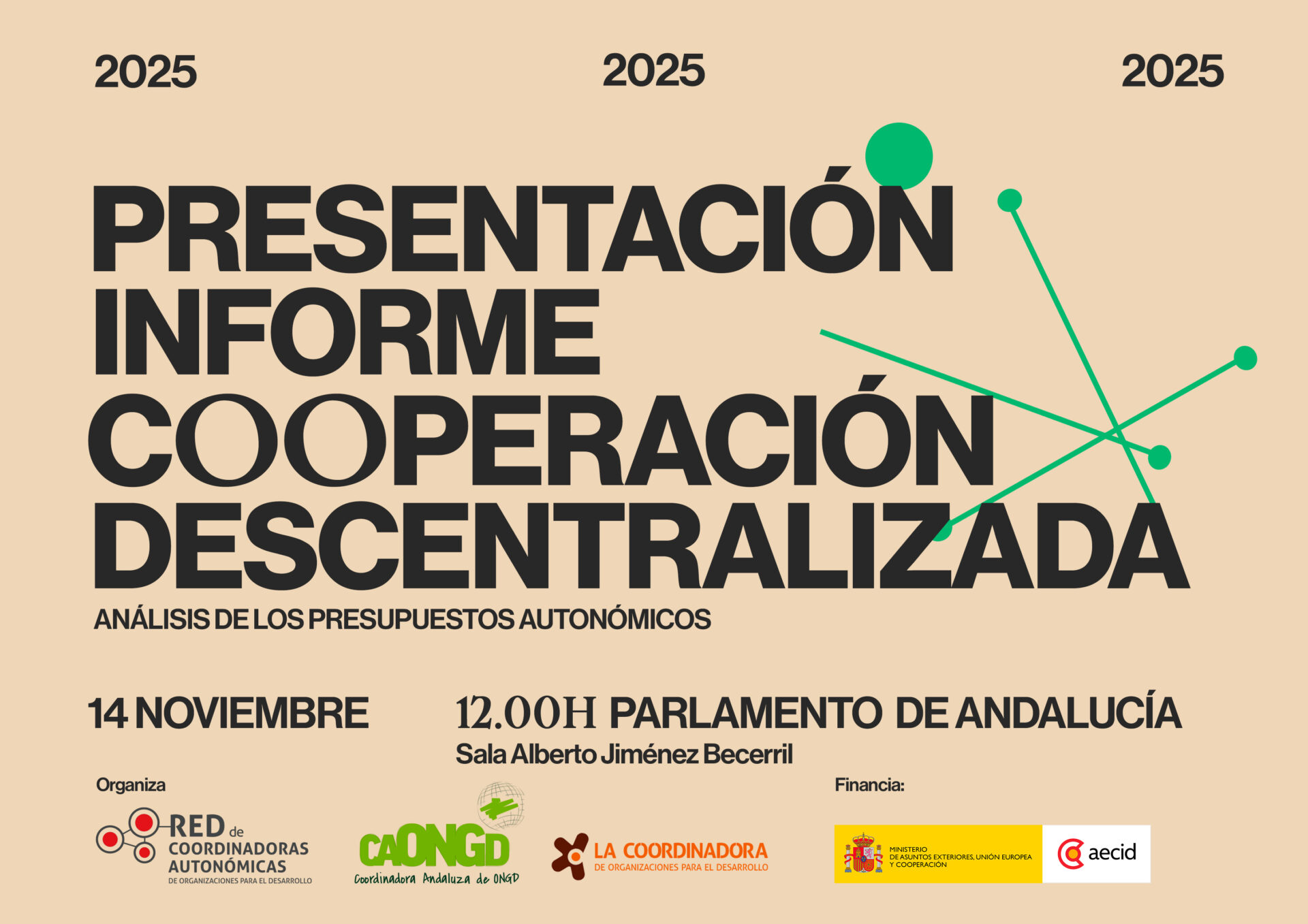En el acto participarán personas expertas del ámbito de la cooperación internacional para el desarrollo, representantes de la administración autonómica y local andaluza así como organizaciones directamente implicadas en esta política pública. La presentación será en el Parlamento de Andalucía, en la Sala Alberto Jiménez Becerril, el viernes 14 de noviembre de 12:00h a 13:30h y podrá seguirse a través de streaming. En breve se dará a conocer el programa definitivo.